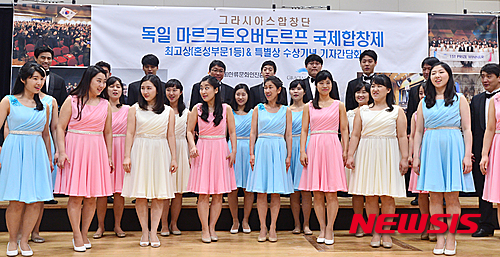 【서울=뉴시스】고승민 기자 = 29일 오후 서울 상암동 YTN에서 열린 그라시아스 합창단 독일 마르크트오버도르프 국제합창제 최고상(혼성부문1등), 특별상 수상기념 기자간담회에서 단원들이 수상곡 중 하나인 '각설이타령'을 합창하고 있다. 2015.05.29.