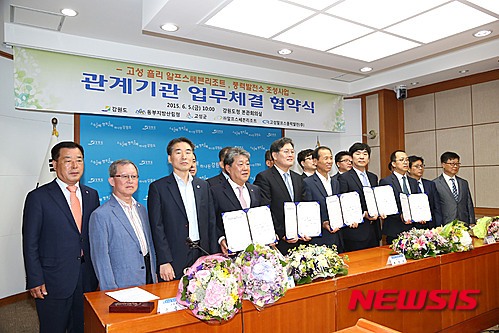 【춘천=뉴시스】박혜미 기자 = 최문순 (왼쪽부터 여섯번째)강원도지사는 지난 5일 강원 춘천시 강원도청에서 ㈜알프스쎄븐리조트(대표이사 김석휴), 고성 알프스풍력발전(주)(대표이사 장기태), 동부지방산림청장, 고성군수와 간성읍 흘리 지역에 알프스 스키장과 풍력발전소를 본격 추진하는 5개기관 간 업무협약을 체결하고 있다. 2015.06.06. (사진=강원도청 제공)