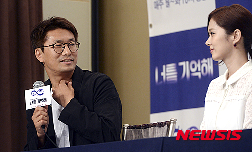【서울=뉴시스】최진석 기자 = 16일 오후 서울 영등포구 타임스퀘어 아모리스홀에서 열린 KBS 새 월화드라마 너를 기억해 제작발표회에 참석한 노상훈(왼쪽) 감독이 사회자의 질문에 답하며 배우 장나라를 바라보고 있다. 2015.06.16.