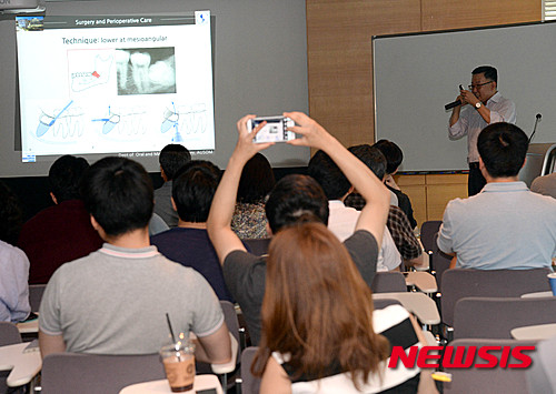 【서울=뉴시스】박태홍 기자 = 아주대학교 치과센터 송승일 교수가 27일 오후 서울 중구 중림동 신흥빌딩 신흥연수센터 대회의실에서 치과의사 60여 명을 대상으로 "발치의 모든 것”, 이라는 주제로 이를 뽑은 후의 중요성과 어려운 발치를 어떻게 잘할 수 있는지에 대한 임상에서 필요한 수술 빙법 등에 대해 강의하고 있다.