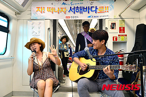 【서울=뉴시스】김선웅 인턴기자 = 메르스사태로 침체된 관광 활성화를 위해 2일 오전 인천국제공항 행 공항철도에서 열린 서해바다열차 미니콘서트에서 정흠밴드의 보컬 정민경이 공연을 펼치고 있다. 2015.08.02.