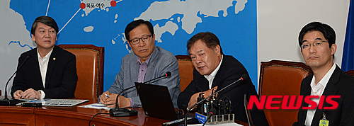 【서울=뉴시스】조수정 기자 = 19일 오후 서울 여의도 국회에서 열린 새정치민주연합 국민정보지키기위원회 제5차 기자간담회에서 자문단장인 정태명 국민정보지키기위원이 취재진의 질문에 답변하고 있다. 왼쪽부터 안철수 국민정보지키기위원장, 문병호 의원, 정태명 성균관대 교수, 위원인 권석철 큐브피아 대표.