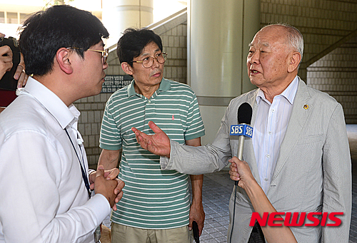 【서울=뉴시스】 조성봉 기자 = 이승만 정권으로부터 '공산당 부역자'로 몰려 총살당했던 독립운동가 고 최능진 선생이 재심에서 무죄를 선고받은 27일 오후 서울 서초구 서울중앙지방법원 입구에서 최 선생의 아들 최만립(오른쪽) 씨가 소감을 밝히고 있다.