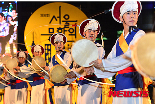 【서울=뉴시스】김선웅 인턴기자 = 28일 오후 서울 중구 서울광장에서 열린 '서울문화의밤'에서 한국예술종합학교 연희과 학생들이 전통공연을 펼치고 있다. 2015.08.28.