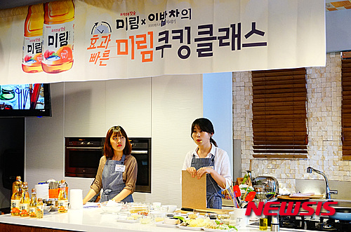 【서울=뉴시스】롯데주류가 4일 서울 잠실동에 위치한 키친101에서 노애리 요리연구가와 함께 미림을 사용해 명절 후 남은 음식재료로 맛있고 쉽게 만들수 있는 '효과빠른 미림 쿠킹클래스'를 진행하고 있다. 2015.09.04. (사진=롯데주류 제공)