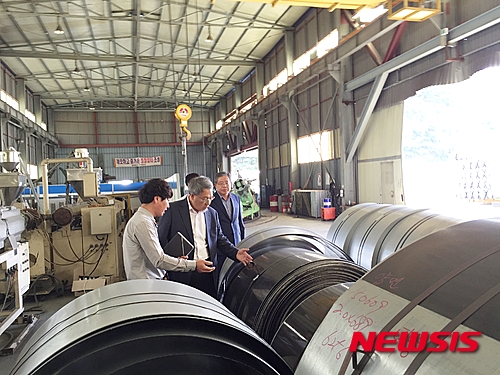 【창원=뉴시스】김기진 기자 = 주계성 경남지방조달청장이 7일 하동군에 위치한 파형강관, 파이프, 하수도관 등을 제조하는 대왕철강㈜ 생산현장을 방문하고 애로 및 건의사항을 청취하고 있다. 2015.09.08. (사진=경남지방조달청 제공)