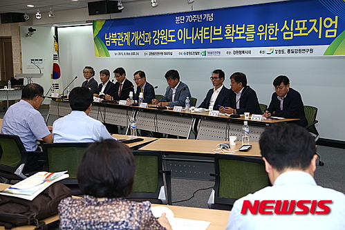 【춘천=뉴시스】박혜미 기자 = 8일 오후 강원 춘천시 강원발전연구원 대회의실에서 강원도의회 김동일 부의장이 참석한 가운데 강원도민일보와 강원발전연구원 주최로 '남북관계 개선과 강원도 이니셔티브 확보를 위한 심포지엄'이 열리고 있다. 2015.09.08. (사진=강원도의회 제공)