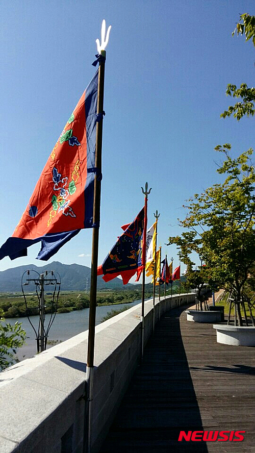 【의령=뉴시스】김기진 기자 = 임진왜란(1592년) 전국 최초의 의병발상지인 역사의 땅 경남 의령에 의병 깃발이 12일 오후 휘날리고 있다. 당시 의령지역의 곽재우 의병부대가 밀려드는 왜군에 대항해 내 걸었던 '천강홍의장군기'를 비롯한 조선시대 깃발이 정암진 전투의 승첩지인 의령관문일대에 설치되어 의령을 찾는 관광객 및 군민들의 시선을 사로잡고 있다. 2015.09.12. (사진=의령군 제공)