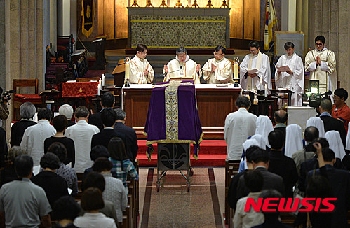 【서울=뉴시스】박문호 기자 = 일제 강점기 일본 홋카이도 강제노역 희생자 115명의 유골이 70년 만에 귀향한 18일 오후 서울 중구 세종대로 대한성공회 성당에서 징용 희생 한국인 봉환 추모와 위로의 성찬례가 거행되고 있다.