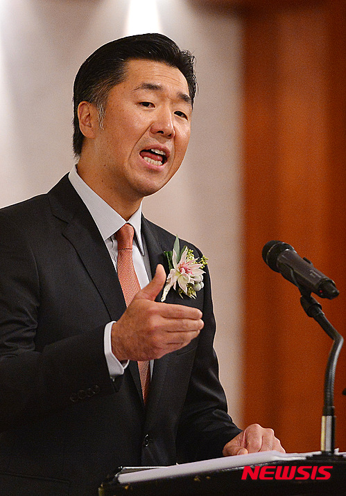 【서울=뉴시스】고승민 기자 = 8일 오전 서울 그랜드 인터컨티넨탈 호텔 서울 파르나스에서 '평화통일과 경제발전'을 주제로 열린 광복 70주년 기념 글로벌피스재단 경제포럼(Global Peace Economic Forum)에서 문현진 GPF 재단 이사장이 기조연설을 하고 있다. 2015.10.08.