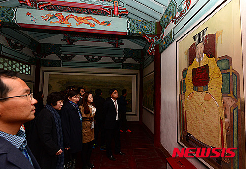 【서울=뉴시스】사진공동취재단 = 개성 만월대 출토유물 남북공동 전시회 개막식 및 학술회의가 15일 개성 고려성균관에서 열렸다. 우리측 역사학자협의회 관계자들이 태조 왕건릉을 찾아 태조 왕건 어진(영정)을 관람하고 있다. 광복 70주년을 맞아 고려 왕궁터이자 유네스코 세계유산인 개성 만월대에서 열린 ‘개성 만월대 출토유물 남북공동 전시회’는 남측 역사학자협의회와 북측 민족화해협의회(민화협)가 공동으로 주최했다. 2015.10.15.