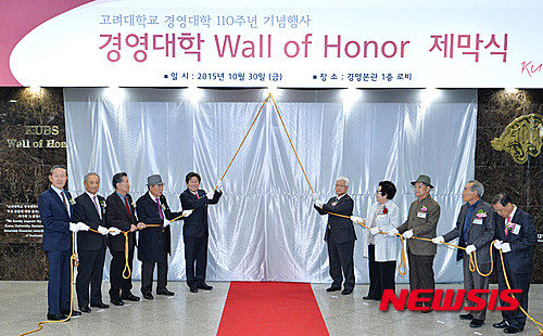 【서울=뉴시스】박문호 기자 = 30일 오후 서울 성북구 고려대학교 경영대학 본관 로비에서 기부자 419명의 이름을 새긴 월 오브 오너(Wall of Honor) 제막식이 열리고 있다.