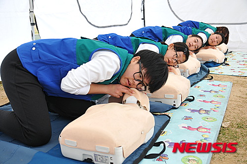 【창원=뉴시스】김기진 기자 = 1일 대한적십자사 경남지사(회장 한창일)는 창원 용지문화공원에서 2015년 응급처치법 경연대회를 개최하고 있다.  도내 초·중·고·대학생 참가자 400여명, 인솔교사, 심사위원, 진행요원 140명 등 총 540여 명이 참여했고 경연방법은 실기경연으로 심폐소생술 및 상처처치 경연으로 이루어졌다.  2015.11.02. (사진=한적 경남지사 제공)