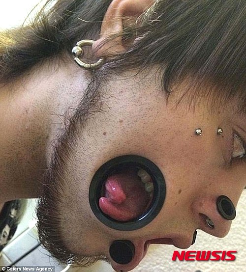 【서울=뉴시스】조엘 미글러(22)라는 이름의 독일 청년은 얼굴에 11개의 피어싱을 해 2015년 기네스북에 올랐다. 사진은 볼에 난 구멍을 통해 조엘이 자신의 혓바닥을 내밀고 있는 모습이다. 그는 혓바닥 끝을 살짝 가르는 수술도 받았다. (사진출처: 데일리메일) 2015.11. 13.