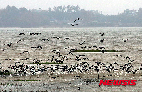 사람이 다가서자 놀란 가창오리들이 수면 위를 날아오르고 있다. 2015.11.18.