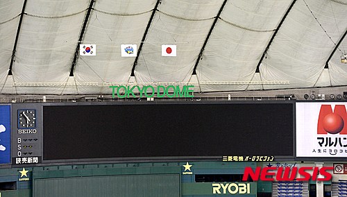 【도쿄(일본)=뉴시스】고범준 기자 = 2015 WBSC 프리미어12 대회에 참가하는 대한민국 대표팀 선수들이 일본과의 준결승 경기를 하루 앞둔 18일 오후 일본 도쿄돔에서 훈련을 마쳤다. 사진은 도쿄돔에 걸린 태극기. 2015.11.18.