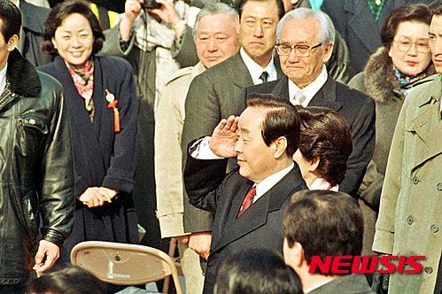 【서울=뉴시스】권주훈 기자 = 김영삼 전 대통령이 22일 0시22분께 서거했다. 향년 88. 사진은 1993년 2월 25일 김영삼 대통령이 서울 여의도 국회의사당 앞 광장에서 노태우, 전두환, 최규하 전 대통령과 3부요인, 외국경축사절이 참석한 가운데 “신한국 창조”를 주제로 제14대 대통령 취임식을 갖고 거수경례를 하고 있다. 2015.11.22.