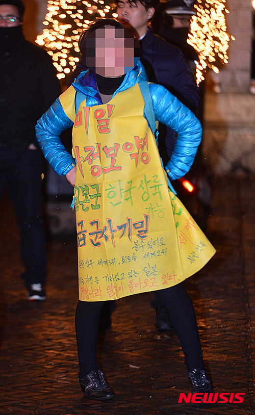 【서울=뉴시스】 배훈식 기자 = 지난해 '호통 아줌마'라 불리며 일왕 생일파티를 규탄했던 여성이 3일 오후 서울 용산구 그랜드하얏트 서울 호텔 입구에서 주한 일본대사관 주최 아키히토 일왕 생일파티를 규탄하고 있다. 2015.12.03.