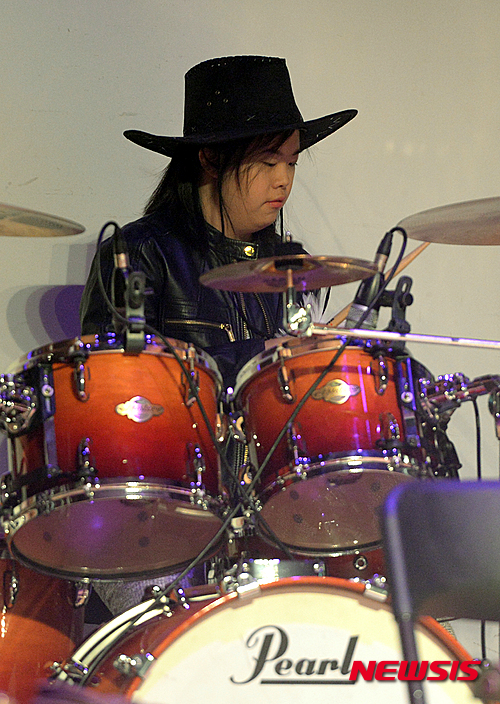 【서울=뉴시스】조수정 기자 = 22일 오후 서울 여의도 국회의원회관에서 열린 국회 자선공연 ‘동고동락(Rock)’ 콘서트 중 대학에서 드럼을 전공하는 나경원 새누리당 의원의 딸 유나 양이 드럼을 연주하고 있다. 2015.12.22.