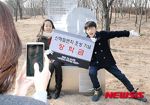 【서울=뉴시스】박문호 기자 = 고 신해철의 데뷔 27주년인 24일 오후 서울 노원구 동일로 북서울 꿈의 숲 꿈의 광장에서 열린 신해철 벤치 제막식에서 부인 윤원희 씨가 가족사진을 찍고 있다.
