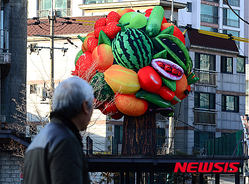 과일나무 조형물은 삭막한 도심을 예술적 상상으로 변화시키는 공공예술 프로젝트인 '도시게릴라 프로젝트'의 일환으로 설치예술가 최정화(54)씨가 서울문화재단 청사에 설치했다. 2016.01.04