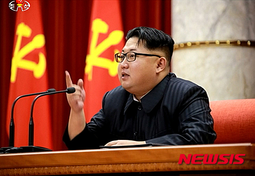 【서울=뉴시스】北 조선중앙TV가 12일 김정은 국방위원회 제1위원장이 당중앙위원회 회의실에서 열린 ‘수소탄 실험 성공’ 핵과학자, 기술자 등에 대한 당 및 국가표창수여식에 참석해 발언하는 모습을 13일 보도했다. 2016.01.13. (사진=조선중앙TV 캡쳐)
