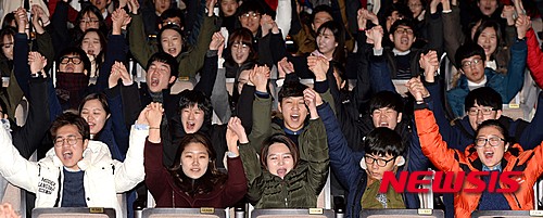 【서울=뉴시스】고범준 기자 = 14일 오전 서울 관악구 서울대학교 문화관 대강당에서 열린 2016년 서울대학교 새내기 오리엔테이션(OT)에서 수시모집 신입생들이 손을 맞잡고 함성을 외치고 있다. 2016.01.14.