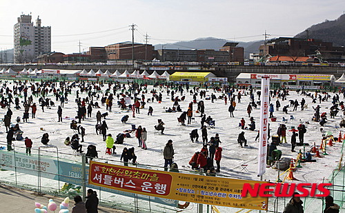 【화천=뉴시스】한윤식 기자 = 27일 강원 화천에서 열리고 있는 산천어축제가 연일 성황을 이루고 있는 가운데 축제장을 찾은 관광객들이 얼음낚시를 즐기고 있다.216.01.27.