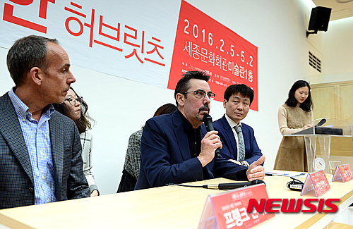 【서울=뉴시스】조성봉 기자 = 4일 오후 서울 종로구 세종문화회관 미술관에서 열린 '마돈나를 춤추게 한 허브릿츠 사진전' 기자회견에서 허브릿츠 재단 마크 맥케나(가운데) 회장이 인사말을 하고 있다. 왼쪽부터 규레이터 프랭크 콘시딘, 마크 맥케나 회장, 사진기획전문회사 디투씨 박덕수 대표.