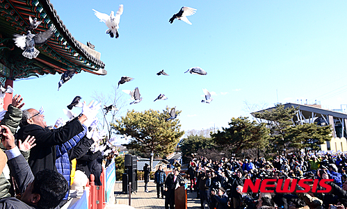 【파주=뉴시스】추상철 기자 = '국민과 세계의 힘 모아 통일의 길을 열자'를 주제로한 2016 피스로드 행사가 열린 15일 오후 경기도 파주시 임진각에서 세계 각국 참가자들이 '평화의 상징'인 비둘기를 날려 보내고 있다. 2016.02.15.