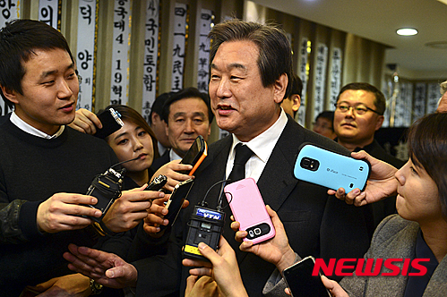 【서울=뉴시스】조성봉 기자 = 김무성 새누리당 대표가 21일 오후 서울 서초구 서울성모병원에 마련된 이기택 전 민주당 총재 빈소를 찾아 조문을 마친 후 취재진과 인터뷰를 하고 있다.