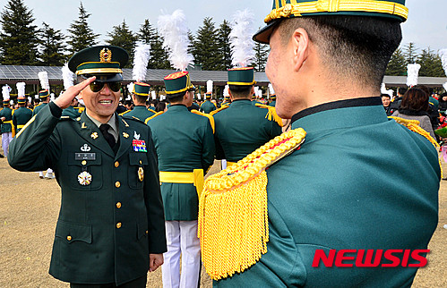 【대구=뉴시스】 배훈식 기자 = 24일 오후 경북 영천시 육군3사관학교에서 열린 51기 생도 졸업식에서 원사인 아버지가 소위 임관을 앞둔 아들에게 경례하고 있다.