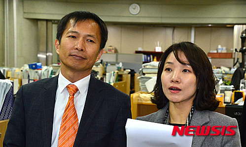 【서울=뉴시스】김선웅 기자 = 민주사회를 위한 변호사 모임 국제통상위원회 노주희(오른쪽) 변호사와 위원장 송기호 변호사가 29일 오전 서울 서초구 서울중앙지방법원 기자실에서 한일간 위안부 협상 문서 정보공개 청구 소송 기자회견을 하고 있다.