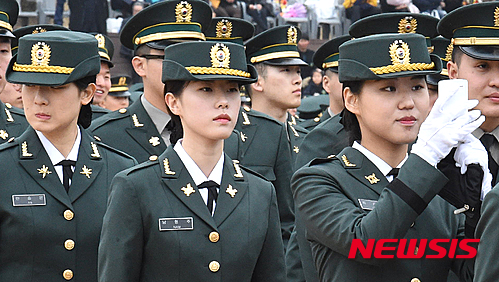 【계룡=뉴시스】함형서 기자 = 4일 오후 충남 계룡시 계룡대 연병장에서 열린 '2016년 장교 합동임관식에서 한 여군이 복장을 점검하고 있다. 2016.03.04.