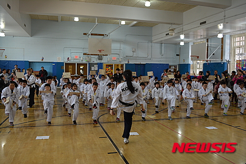 【뉴욕=뉴시스】노창현 특파원 = 뉴욕시 공립학교에 태권도를 보급하고 있는 '코리아 태권도(대표 레지나 임)'가 유치원과 초등생 1, 2 학년에게 첫 태권도 수업을 제공하고 있어 관심을 모은다. 코리아 태권도는 지난 11일 플러싱에 위치한 PS 163Q 초등학교에서 140명의 1학년 벨트 졸업식을 가졌다. 태권도복은 뉴욕한국문화원에서 제공한 것으로 163Q 초등학교는 뉴욕에선 유일하게 유치원부터 1, 2학년 어린이들이 전원 태권도를 정규과목으로 배우고 있다. 2016.03.13. <사진=코리아태권도 제공>