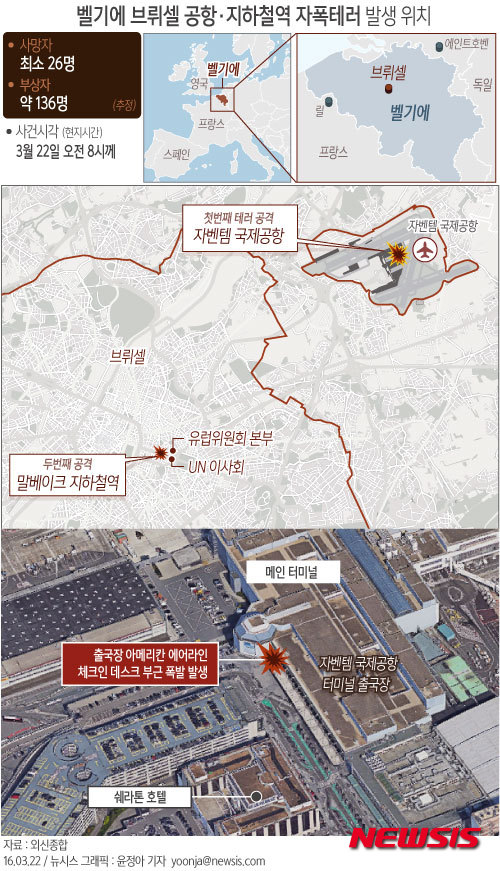 【서울=뉴시스】윤정아 기자 = 22일(현지시간) 오전 8시께 벨기에 수도 브뤼셀의 공항과 시내 지하철역에서 3건의 폭발이 일어났다. 이날 최소 26명이 사망하고 136명이 부상했다.