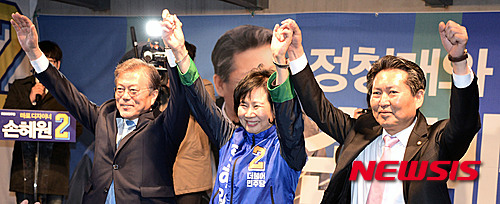 【서울=뉴시스】홍찬선 기자 = 4.13 총선 서울 마포을에 출마한 더불어민주당 손혜원 후보의 선거사무소 개소식이 열린 24일 오후 문재인 전 대표, 정청래 의원이 손 후보와 함께 손을 들어 화답하고 있다. 2016.03.24.