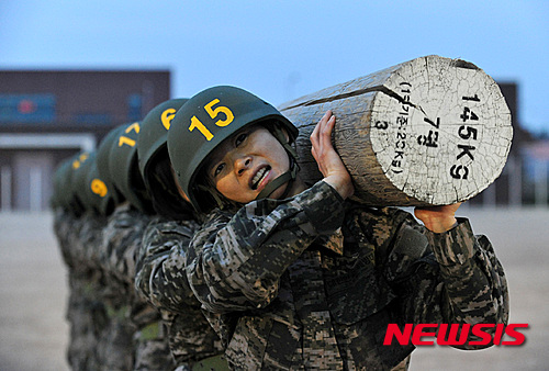 【서울=뉴시스】이영환 기자 = 브라질 리우 올림픽을 앞두고 정신무장을 위해 해병대 극기훈련에 입소한 여자 핸드볼 국가대표팀 선수들이 29일 경북 포항 해병대 교육단에서 목봉체조를 하고 있다. 2016.03.30. (사진=해병대사령부 제공)