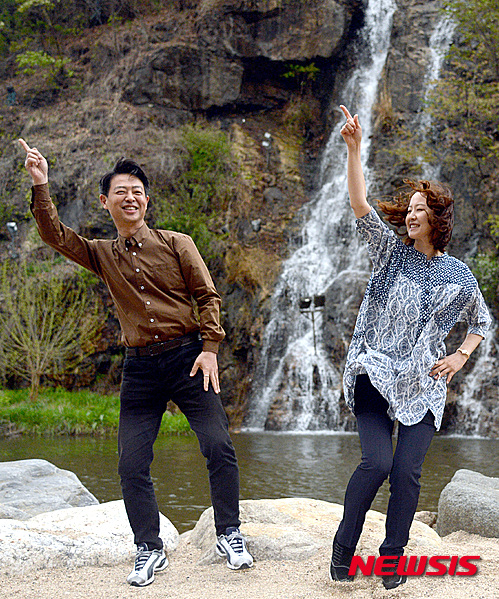 【서울=뉴시스】조수정 기자 = 더불어민주당 김영호 서울 서대문을 당선인이 18일 오후 서울 홍제천 폭포에서 서대문(을) 투표율 61%를 넘긴데 대해 지역주민들에게 감사의 뜻을 전하기 위해 입수 퍼포먼스를 하기 앞서 배우자 정현경 씨와 픽미댄스를 선보이고 있다. 2016.04.23.