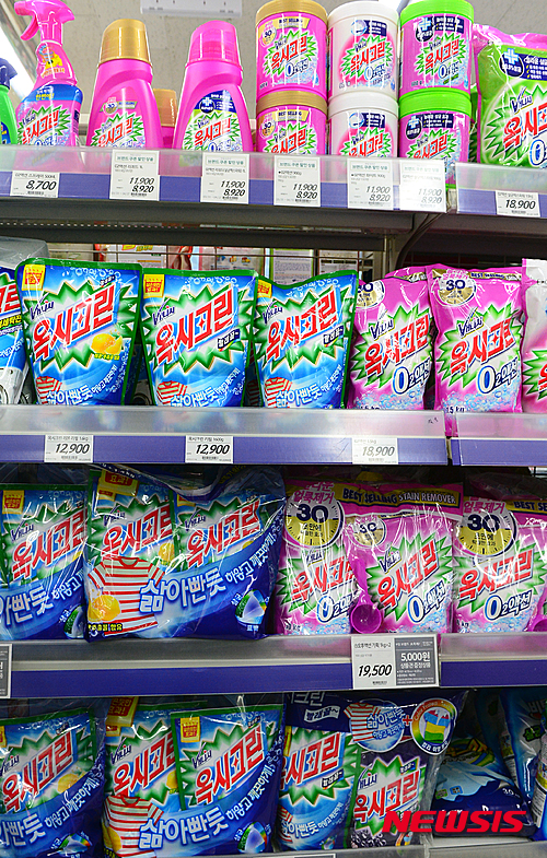 【서울=뉴시스】권현구 기자 = 가습기 살균제 사건과 관련해 가장 많은 피해자를 낸 옥시래킷 벤키저가 공식 사과를 했지만 온라인을 중심으로 불매운동이 번지고 있는 24일 오후 서울 시내 한 대형마트에 옥시크린 제품이 매대에 진열되어 있다. 2016.04.24.