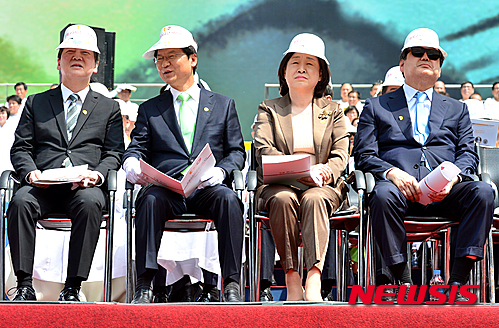 【서울=뉴시스】배훈식 기자 = 국민의당 안철수(왼쪽부터), 천정배 공동대표, 정의당 심상정 대표, 새누리당 김무성 전 대표가 1일 오후 서울 마포구 상암월드컵경기장에서 열린 원불교 100주년 기념대회에 참석해 나란히 앉아있다. 2016.05.01.