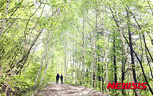 【진안=뉴시스】유영수 기자 = 전북 진안군 부귀면 운장산 남쪽 끝자락에 형성된 자작나무 길을 4일 관광객들의 산책하고 있다. 자막나무 잎은 먹물을 찍어 놓은 듯 줄기는 실가지까지 눈부신 흰색 사잇길 마저도 무채색의 아스라함이다.2016.05.04.(사진=진안군청 제공)
