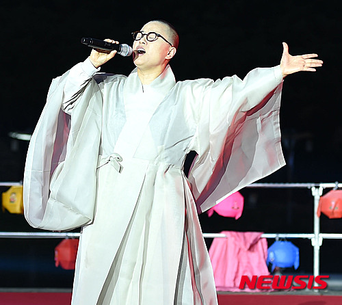 【밀양=뉴시스】안지율 기자 = 6일 오후 경남 밀양시 삼문동 밀양강둔치에서 열린 불기 2560년 자비로운 마음, 풍요로운 세상 부처님 오신 날 점등식에 참석한 인드라 스님이 식전공연을 펼치고 있다. 2016.05.06.