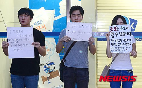 【서울=뉴시스】권현구 기자 = 22일 오후 서울 강남구 서울지하철 2호선 강남역 10번 출구에 '강남 묻지마 살인사건' 피해자 여성을 추모하는 시민들이 남·녀 갈등 없는 사회를 바라는 피켓을 들고 있다. 2016.05.22.