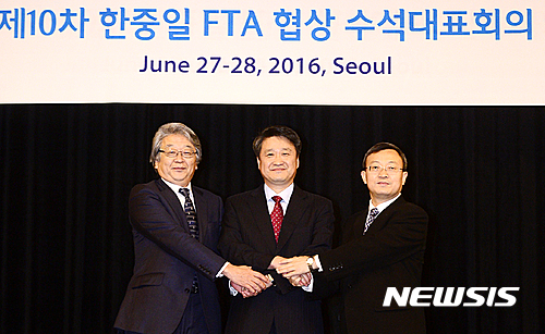 【서울=뉴시스】추상철 기자 = 한중일 FTA 10차 협상 수석대표회의가 열린 27일 오전  서울 종로구 JW 메리어트 호텔 동대문에서 김학도(왼쪽 두번째) 산업통상자원부 통상교섭실장과 일본 나가미네 야수마사(왼쪽) 외무성 경제담당 외무심의관, 중국 왕셔우원(오른쪽) 상무부 부부장이 회의 전 손을 맞잡고 기념촬영을 하고 있다. 2016.06.27.
