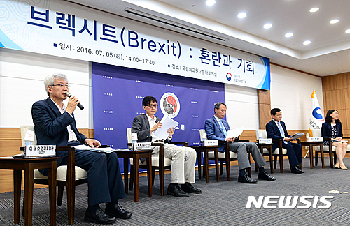 이번 세미나는 브렉시트(Brexit, 영국의 유럽연합 탈퇴)의 현황과 이에 따른 정치·경제 등 제반분야에서 대응방안을 모색하기위해 마련됐다. 왼쪽부터 이태호 경제조정관, 김흥종 대외경제정책연구원(KIEP) 선임연구원, 최진우 한양대학교 교수, 강선구 LG경제연구소 수석연구원, 전혜원 국립외교원 유럽아프리카연구부 교수. 2016.07.05.