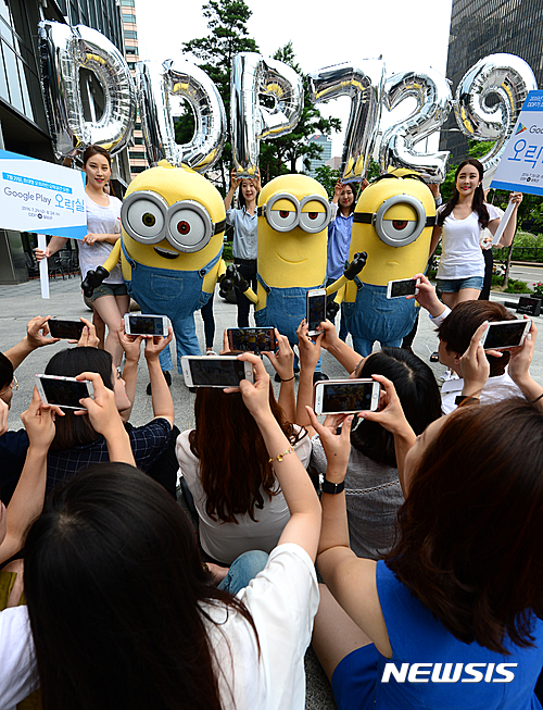 【서울=뉴시스】조수정 기자 = 구글코리아의 오프라인 오락공간 '구글플레이 오락실' 개장을 기념해 21일 오전 서울 중구 수표동 시그니쳐타워 앞 광장에서 시민들이 슈퍼배드 미니언 러쉬의 인기 캐릭터 '미니언' 캐릭터 옷을 입은 모델들과 사진을 찍고 하고 있다.