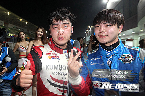 【서울=뉴시스】지난 30일 강원 인제 스피디움에서 열린 2016 CJ대한통운 슈퍼레이스 SK ZIC 6000 클래스 나이트레이스에서 우승을 차지한 정의철(왼쪽, 엑스타레이싱)과 2위 김동은(코리아익스프레스)이 포즈를 취하고 있다.