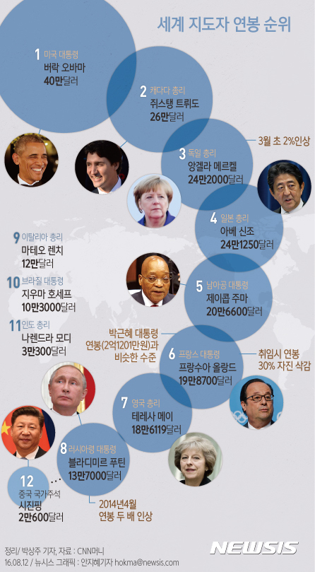 【서울=뉴시스】안지혜 기자 = CNN머니가 11일(현지시간) 세계 주요 지도자들의 연봉을 비교해 보도했다. 세계 지도자 연봉 랭킹 1위는 미국 버락 오바마 대통령으로 40만 달러(약4억4040만원)달러를 받고 있다.