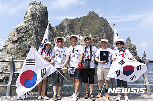 【서울=뉴시스】권현구 기자 = 광복절을 맞은 15일 오전 한국방송통신대학교 전국총학생회와 교직원으로 구성된 '방송대 독도탐방단'이 한국방송통신대학교 개교 44주년을 맞아 독도를 찾아 기념촬영을 하고 있다. 2016.08.15. (사진=한국방송통신대학교 제공)